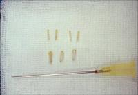 Abb. 1: TransplantateDie besten Voraussetzungen für ein Gelingen der Haartransplantation sind dann gegeben, wenn das so genannte "Spenderhaar" am Hinterkopf sehr kräftig und dick ist und nur auf einer relativ kleinen Fläche der Haarausfall vorherrscht. Somit kann man kräftige, gesunde Haarwurzeln in ein dünn behaartes Gebiet verpflanzen und erhält immer ein zufrieden stellendes Resultat.